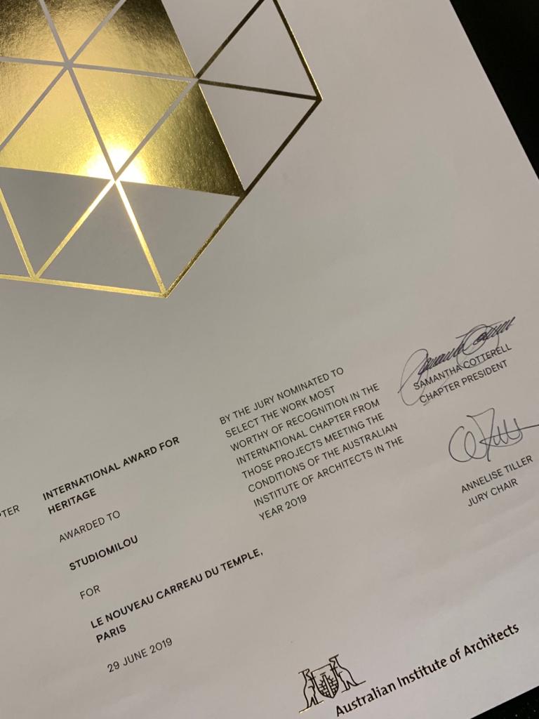Jean Francois Milou and the studioMilou team is honoured to announce the Australian Institute of Architects International Chapter Heritage award for ‘Le Carreau du Temple’ in Paris.