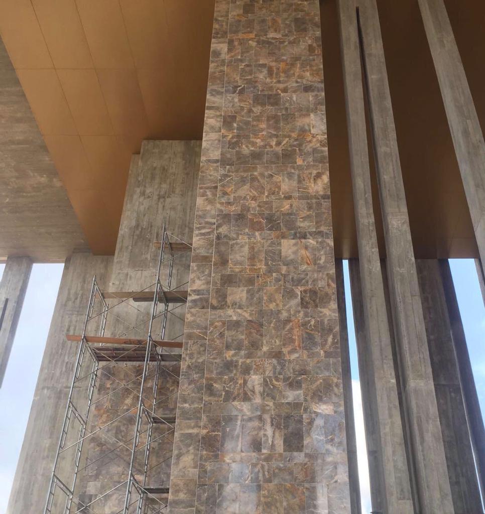 In the convention center in Quy Nhon, studioMilou is using the beautiful grey honey marble of Thanh Hoa to merge with the wood and natural concrete color scheme. This very common marble in Vietnam has proven in this exercise, to be a very spectacular match with this large scale project. This convention center project in Quy Nhon is scheduled to be completed in July 2020.