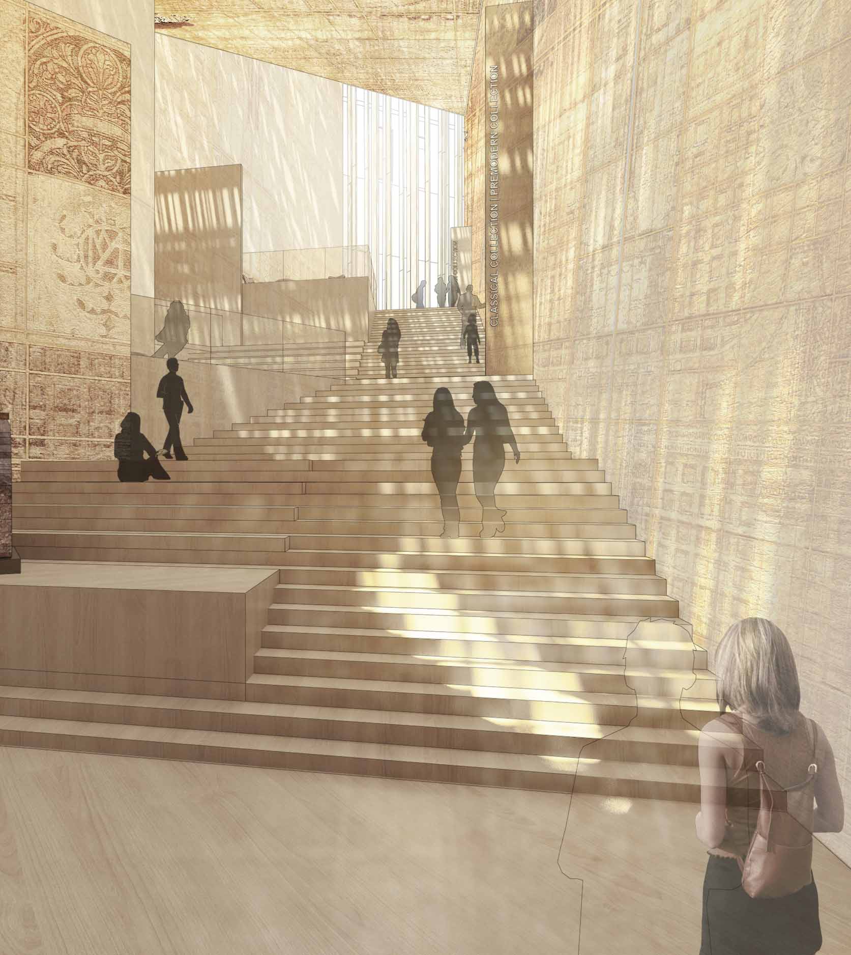 In 2019, GNM had asked StudioMilou to submit a concept paper for the restoration of the new fine arts museum on Pushkin street. The project proposed by the StudioMilou creates new protected public spaces and organizes the life of the museum around a spectacular triangular courtyard leading to all the museum department.